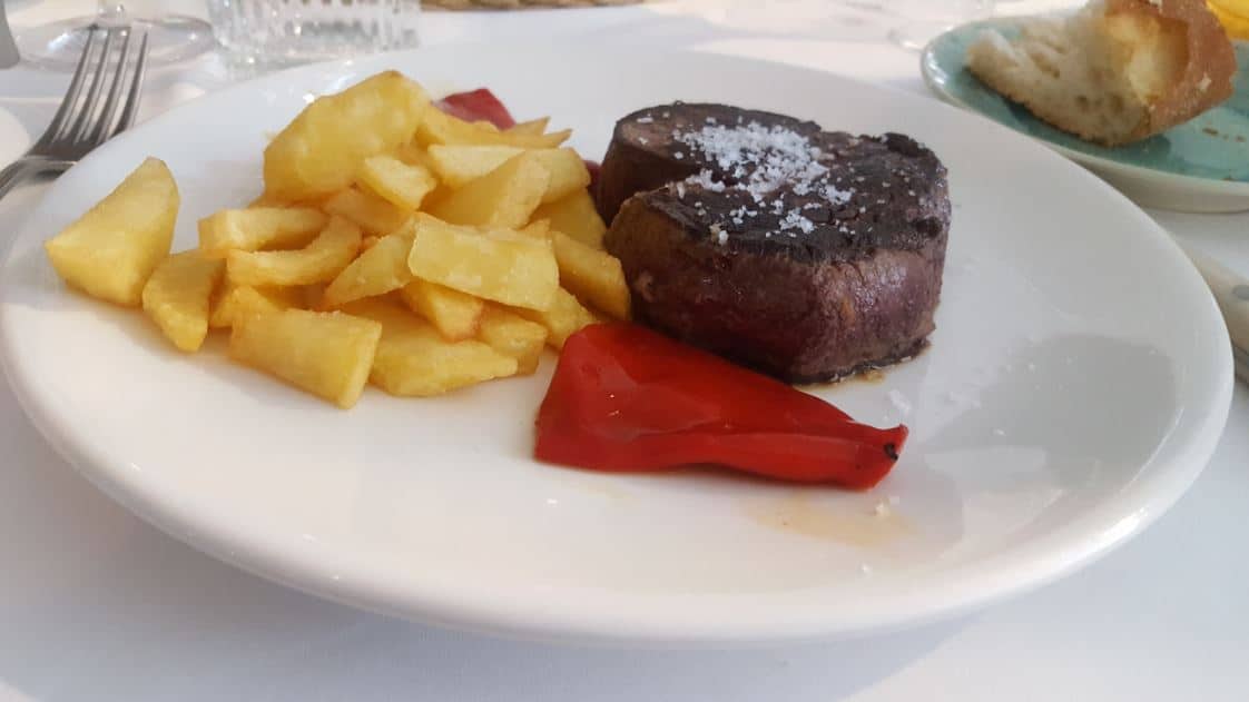 Solomillo acompañado de patatas fritas y pimiento. Una carne sumamente blanda y de calidad. Sin duda podemos decir que menos es más. Sólo con un poco de sal y listo para comer.
