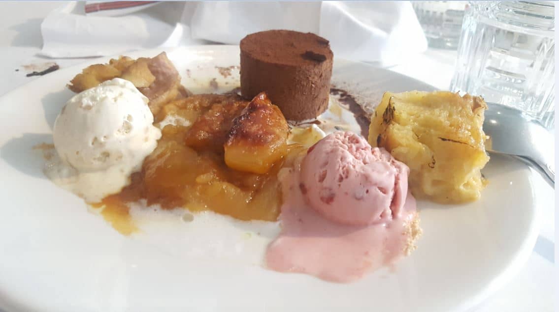 Seleccíon de El jardín: Torrija en pan brioche, compota de manzana, parfait de chocolate y helado. Un postre variado para compartir al centro de la mesa y poner un broche final a la excelente comida.