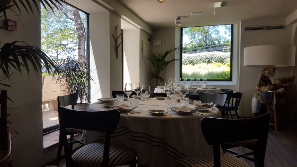 Ya en el interior del restaurante, en la zona más baja, podemos ver varias zonas. Hay un salón interior, una terraza con vistas al jardín y una zona exterior con mesas en el jardín. Todas las zonas tienen su encanto, con una decoración muy cuidada y elegante, pero si tuviese que elegir, recomendación personal sin lugar a dudas es que pidáis una mesa en el exterior.