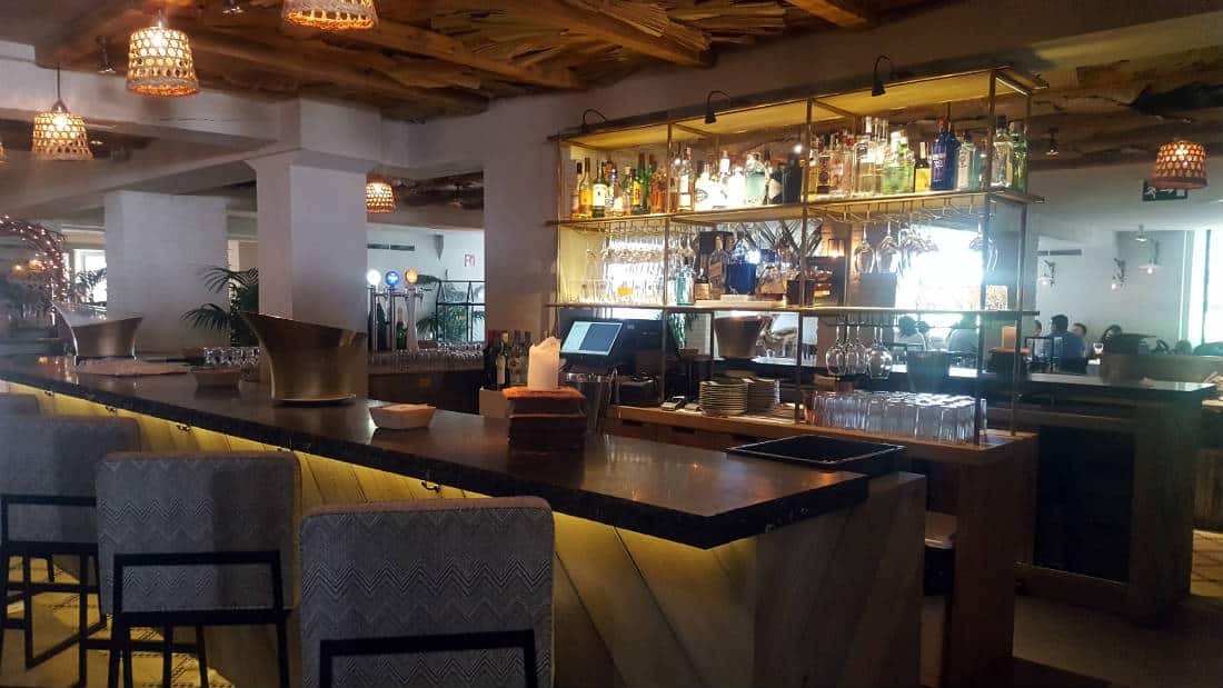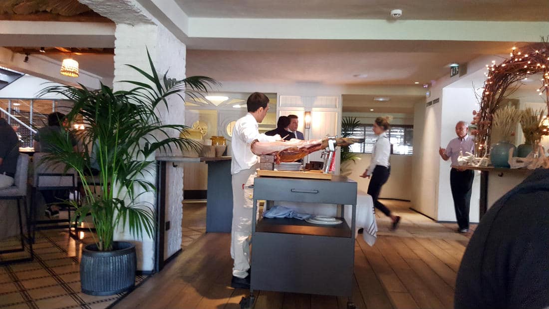 Volviendo al interior, destacamos tres cosas que nos llaman la atención: la primera de ellas es una enorme cocina vista, concepto que siempre gusta a los comensales y que popularizó el afamado Chef Francés Jöel Robuchon. Lo segundo es una gran sala cubierta por una cristalera que hace las veces de vinoteca, la variedad de la carta de vinos es realmente amplia y variada. Por último, destacamos un producto muy español: el jamón. Vemos un cortador de jamón a la entrada del restaurante, el cual se dedica en exclusiva a esta tarea y de forma activa según pudimos ver.