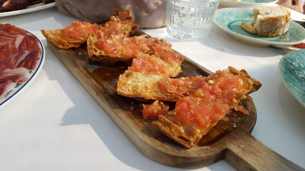 Pan rústico ligeramente tostado con tomate y aceite de arbequina, acompañamiento del jamón.