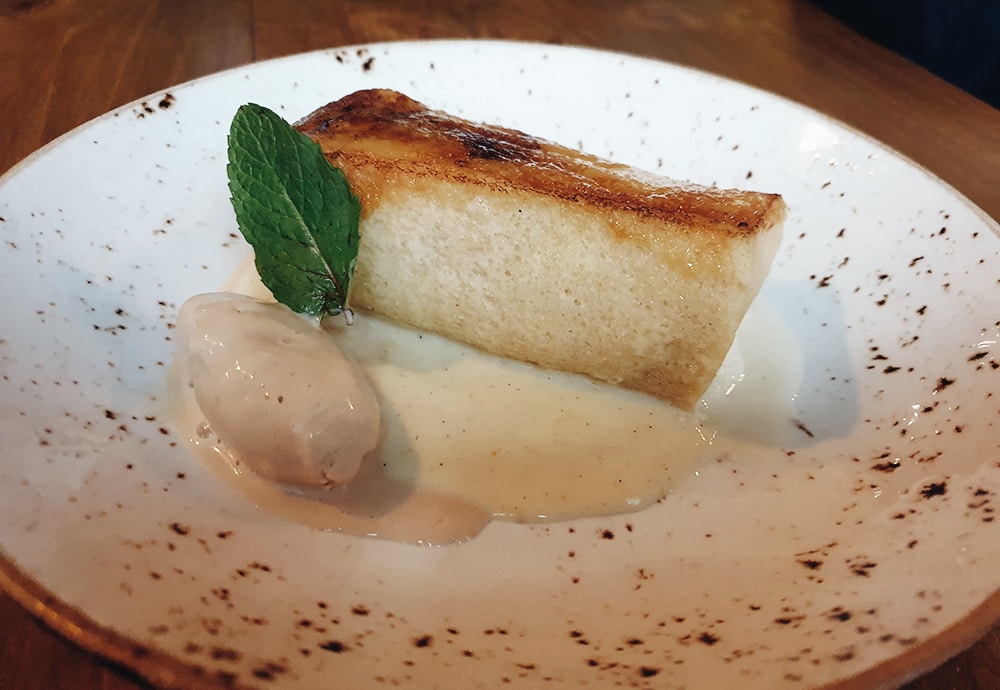 Terminamos con el plato dulce, en este caso nos decantamos por una torrija templada, sobre natillas caseras y helado de turrón.