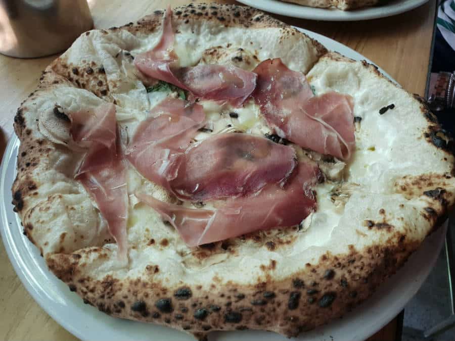 Nuestra segunda pizza para compartir fue la Pizza Borghese: base bianca de crema trufada y mozzarella, prosciutto di Parma y champiñones. Pizza muy cremosa, con un sabor potenciado a trufa. Sería difícil decidir cual nos gustó más.