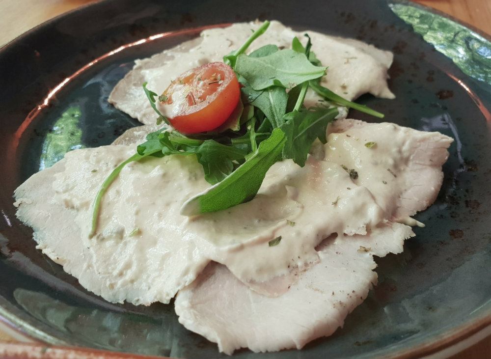 Empezamos nuestra comida con un entrante típico italiano, Vitello Tonnato, un redondo de ternera blanca en lonchas, acompañado de una mayonesa de atún, anchoas y alcaparras. Un plato peculiar que nos sorprendió bastante por la mezcla de sabores. Esta característica mayonesa con sabor a atún contrasta muy bien con la carne y lo hace un plato muy singular. Te lo recomendamos.