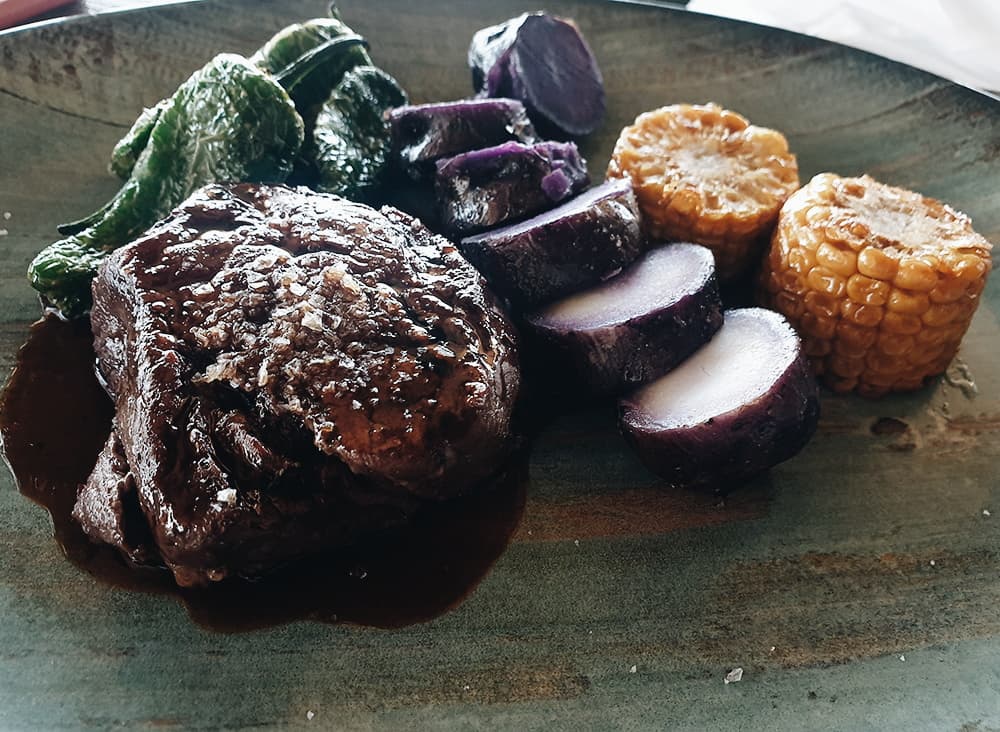 Seguimos con un solomillo de gallega a la brasa, con jugo de carne de patatas violetas asadas, mazorca de maíz y pimientos de Guernika. Una carne de calidad.