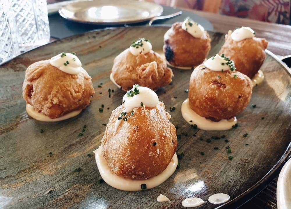 Sin más, vamos con el primer entrante, unos buñuelos de bacalao. Buñuelos de bacalao con mahonesa de wasabi, especiado y con un toque ligeramente picante. Deliciosas.