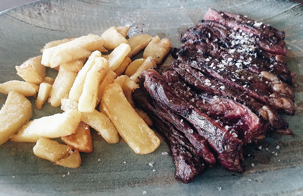Continuamos con entraña al carbón de encina. Entraña de vaca gallega con guarnición de patatas fritas. Una carne muy sabrosa.