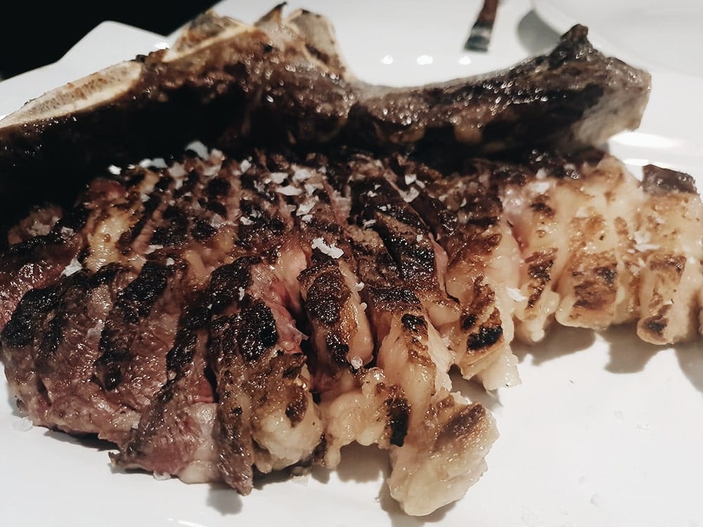 Y ahora vamos con el plato fuerte, Chuleta de Vaca con 40 días de maduración. Seleccionan la pieza y te la muestran para que le des el visto bueno con el peso de la pieza. Un espectáculo la carne: tierna, en su punto y con mucho sabor. Para aquellos que les guste un sabor más fuerte de la carne hay otra opción con más días de maduración.