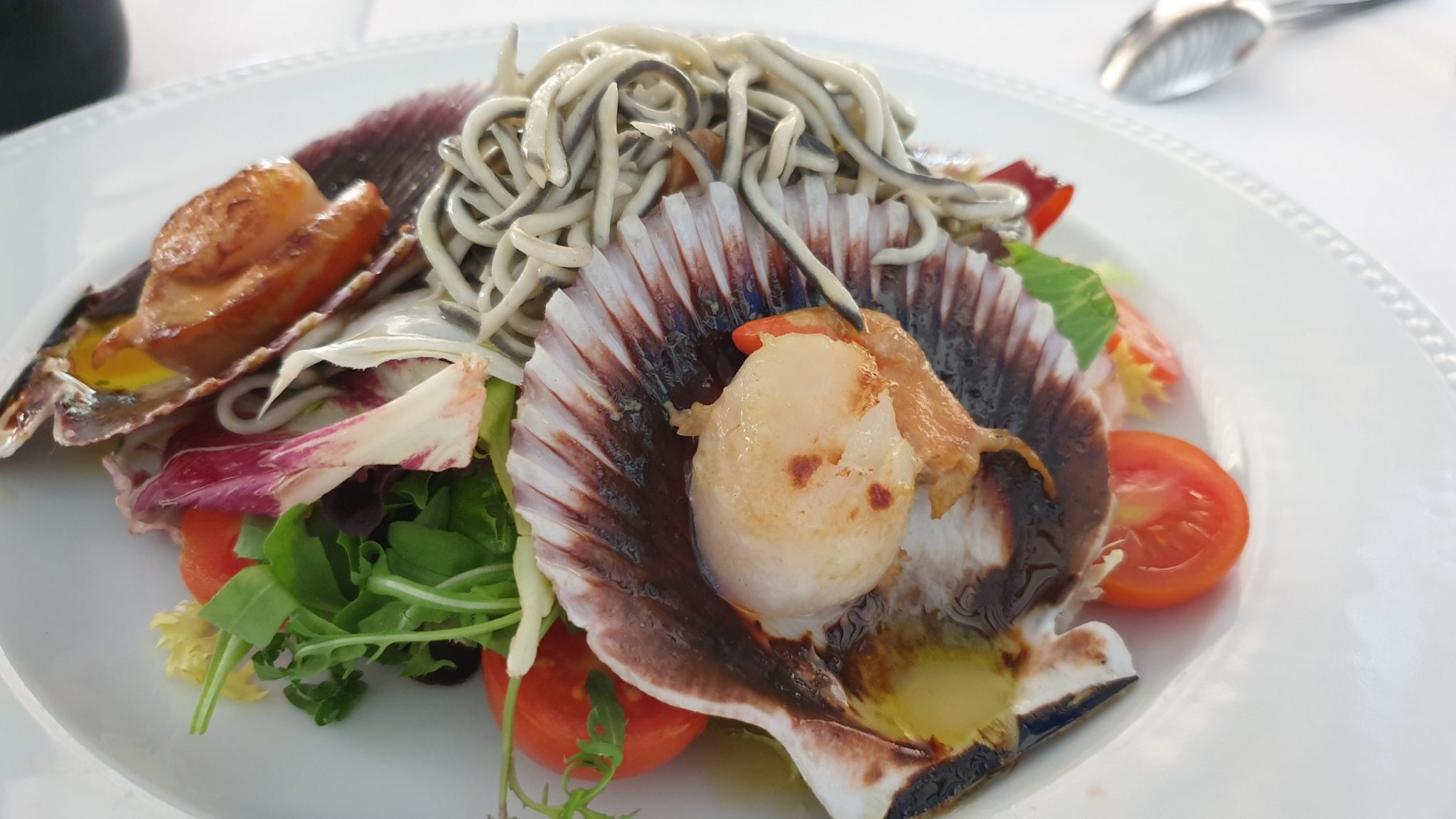 Continuamos con un plato fuera de carta y que nos resultó sorprendente por su originalidad, una combinación deliciosa de ensalada con gulas y vieiras templadas.