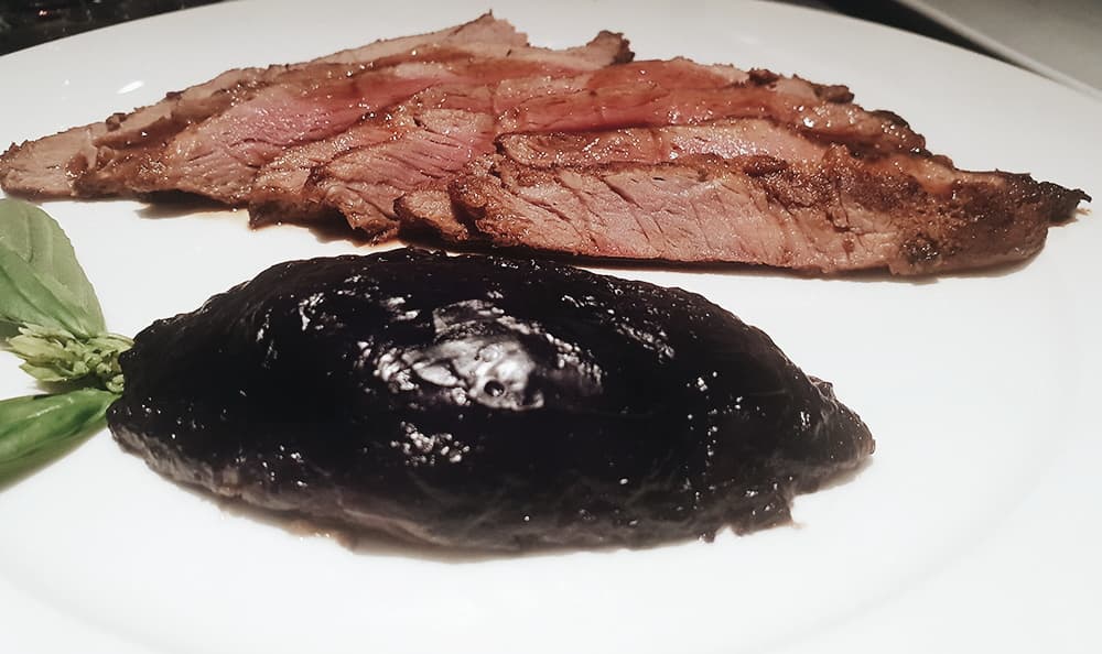 Finalizamos los principales con una presa ibérica asada, con una guarnición muy original de berenjena y queso.
