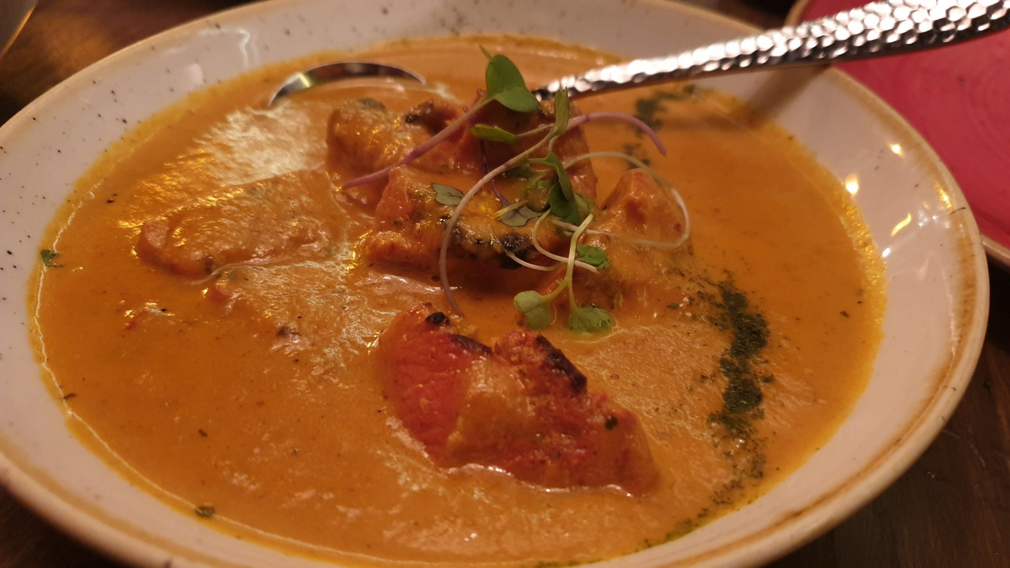 Murghi Ka Tikka Massla: Pollo con salsa cremosa de suaves especias e hierbas aromáticas. Un plato con una salsa deliciosa y poco picante.