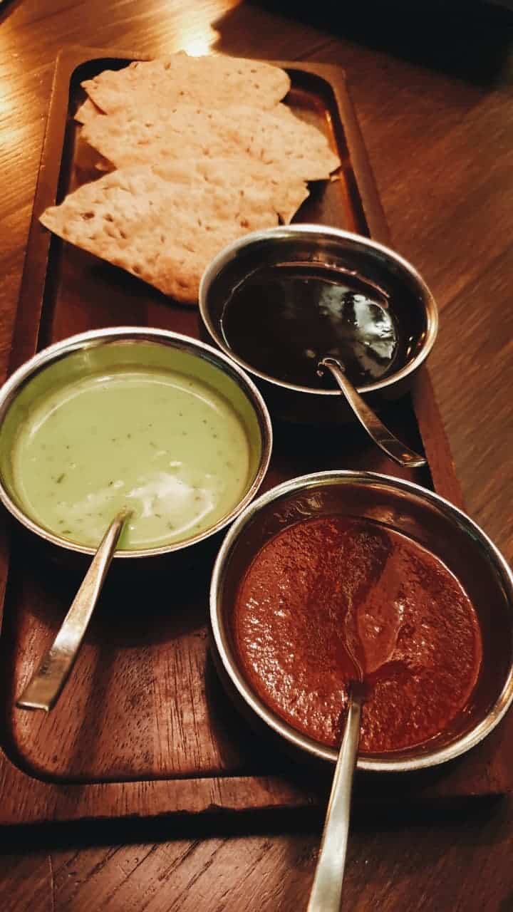 El menú empieza con un aperitivo de Papadum (crujientes tortas de harina de lenteja con comino) acompañado de diferentes salsas de especias y hierbas aromáticas con distintos toques picantes.