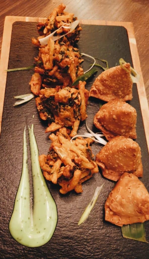 La primera de las estaciones está compuesta por Keema Samosa: empanadillas de masa crujiente rellena de carne, cebolla, jengibre, semillas de cilantro y más especias. Por otro lado, tenemos Pakora: Verduras rebozadas en harina de garbanzos.