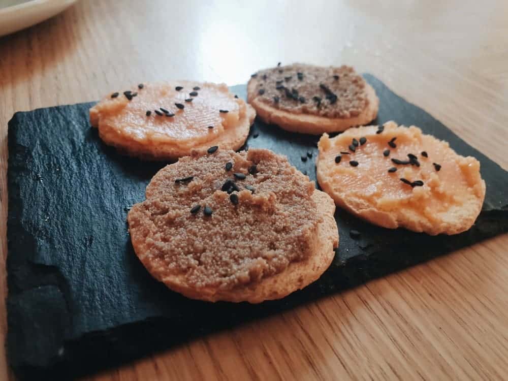 Empezamos con unos aperitivos con homenaje a la semana de la cocina canaria: unas tostas de mogrote (queso para untar con pimentón y pimienta, a los que les gusten los sabores fuertes les encatará) y tostas de huevas de atún muy ricas.