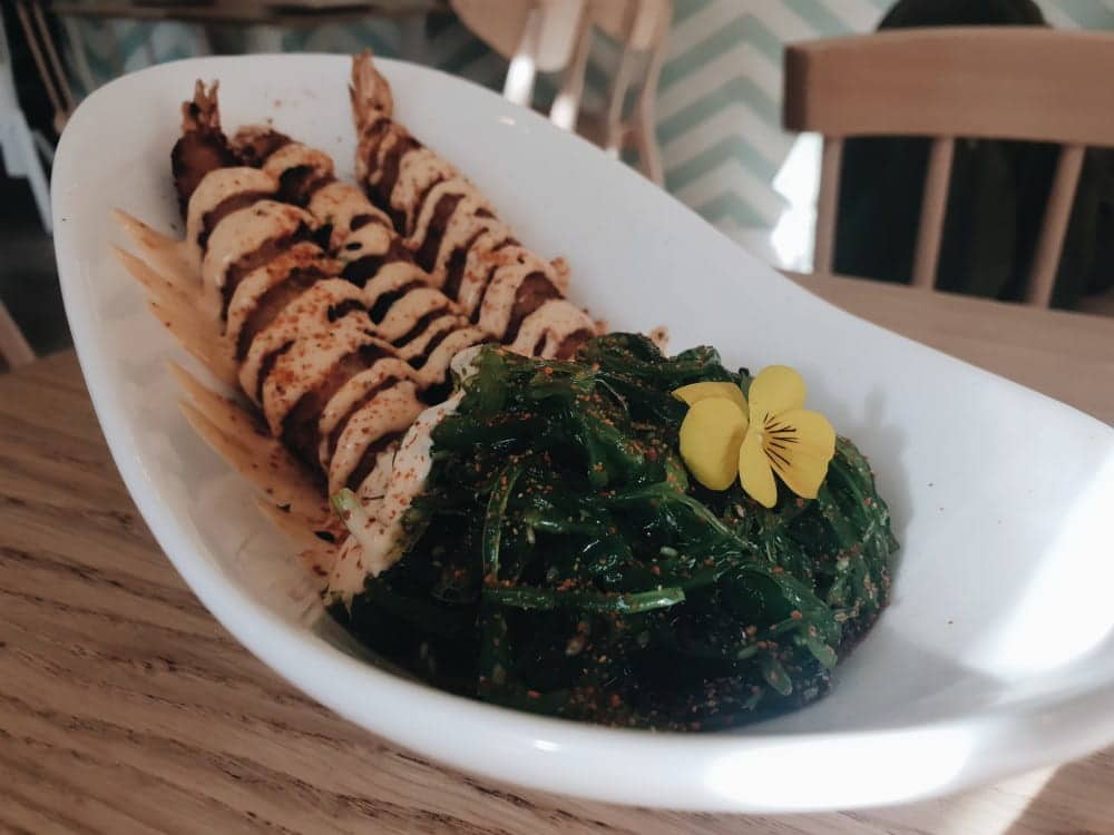 Ebimayo con alga wakame y tobiko. Langostino tigre en panko sobre cama de alga wakame, huevas de tobiko y mayonesa kimchi. Un plato que te le puedes perder, el frescor del alga wakame con el contraste de los langostinos.