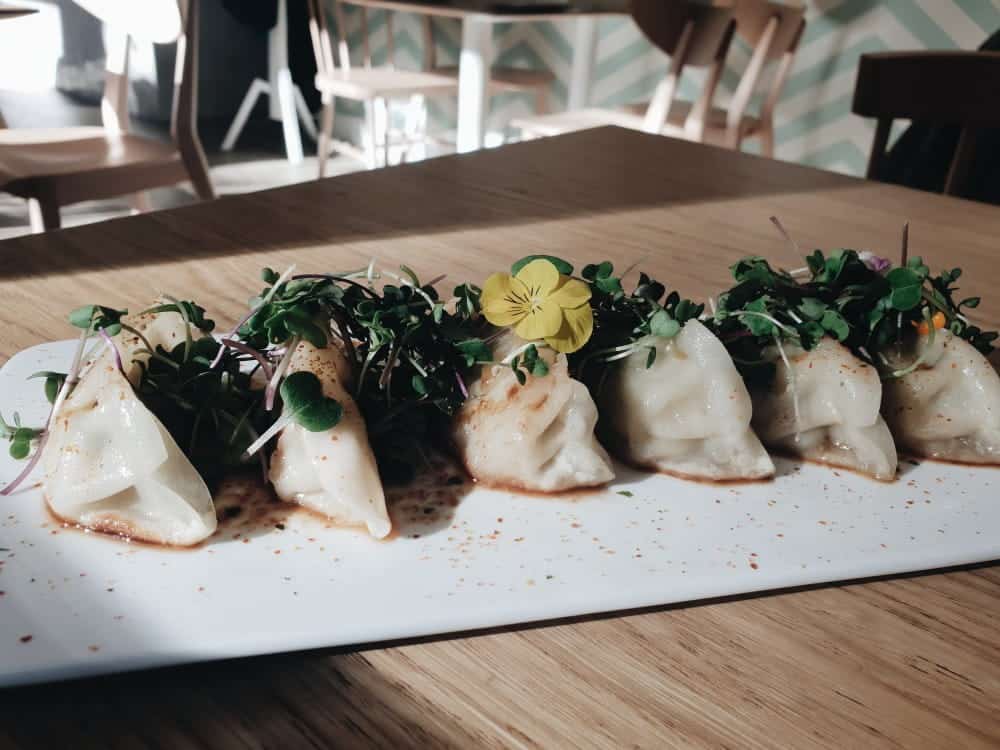Gyozas de pollo y verduras. Dumplings al vapor, rellenos de pollo y verduras con salsa ponzu y brotes japoneses. Una combinación deliciosa de las gyozas con los brotes.