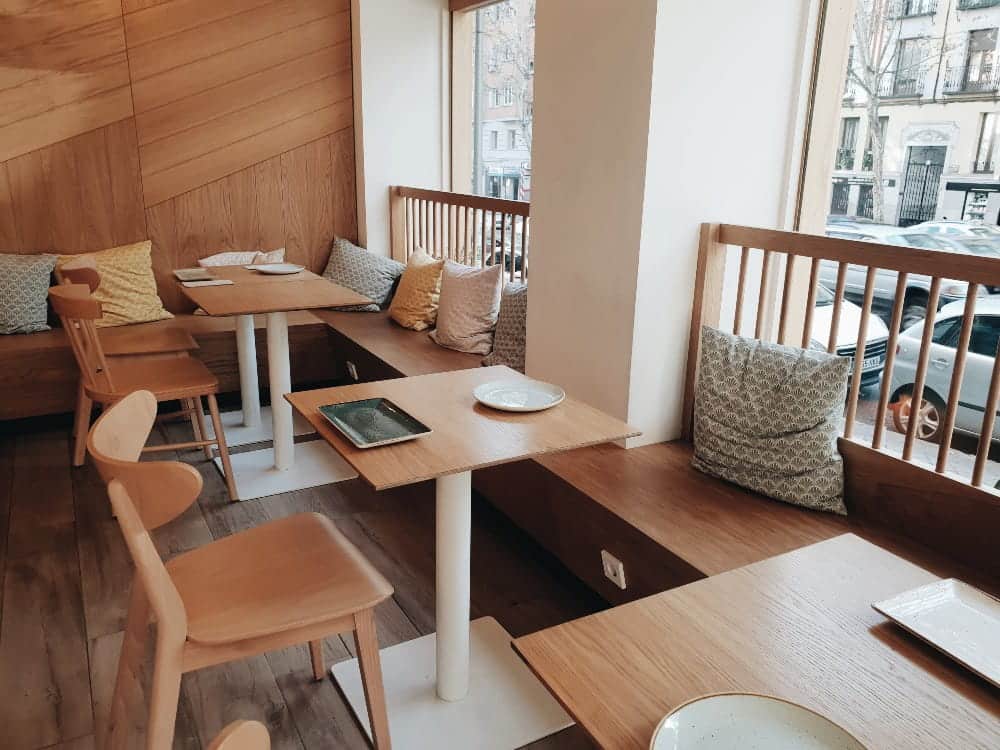 En el otro lado, ya entras en el salón principal donde encuentras desde mesas altas junto a sus grandes cristaleras, hasta mesas bajas con sus cojines, para que te sientas como en casa. Pasando también por su zona de barra, puedes tomar algo rápido si vienes con prisas. Desde luego todo el mundo tiene cabida según el plan que traiga.