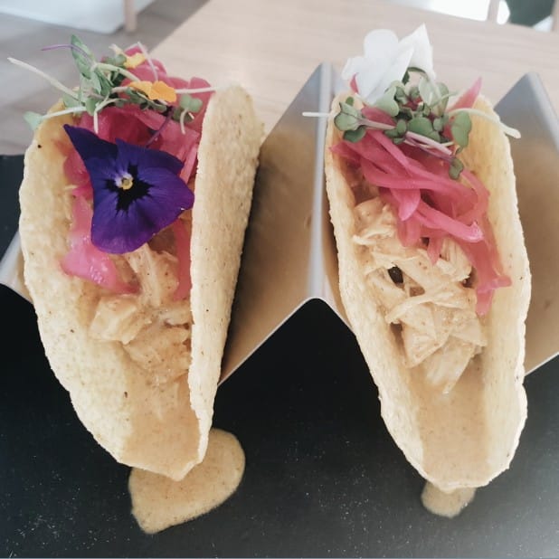 Tacos massala. Tacos de pollo tikka massala con dados de mango y mix de brotes. Entra la india y Mexico. Un plato que nos encantó, sobre todo por la potencia de sabor y la salsita espectacular.