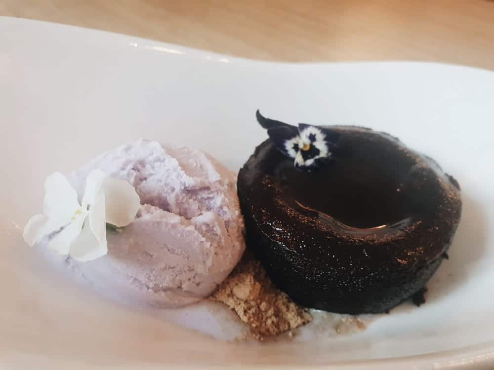 Volcan de chocolate. Coulant con helado de violeta sobre base de galleta de jengibre. Un imprescindible para los más golosos.